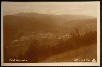 Velké Opatovice, fotopohlednice, celkový pohled, prošlá, stržená známka, Q2