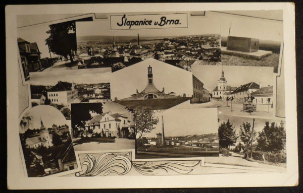 Šlapanice, 10okénková, fotopohlednice, mohyla míru, náměstí, kostel, celkový pohled, prošlá, stržená známka, Q2