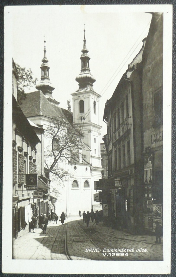 Brno, fotopohlednice, pohled do ulice ke kostelu, prošlá, průpichy od špendlíku, Q2
