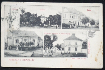 Hrabyně, 4okénková, zámek, škola, kostel, hostinec, prošlá, stržená známka, Q2
