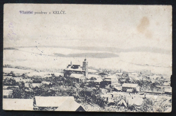 Kelč, celkový pohled, prošlá, Q3, poškozený pravý okraj pohlednice