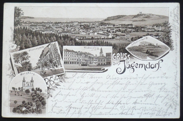 Krnov (Jägerndorf), 5okénková litografie, prošlá, dlouhá adresa, Q2
