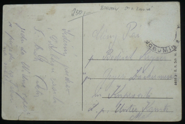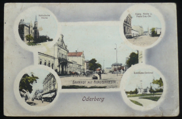 Bohumín (Oderberg), 5okénková, kostel, pohled do ulice, prošlá, stržená známka, Q3 natržená v pravém dolním růžku