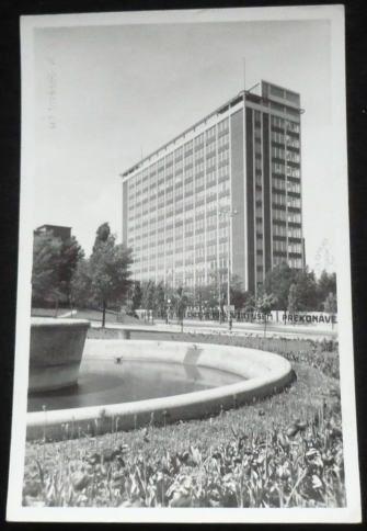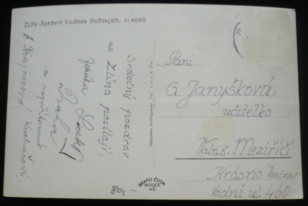 Zlín, fotopohlednice, správní budova, prošlá, stržená známka, Q2