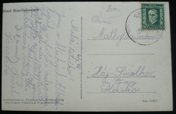 Karlova Studánka (Bad Karlsbrunn), fotopohlednice, lázeňské domy, prošlá, Q2