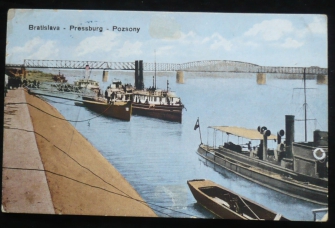 Bratislava (Pressburg, Poszony), lodě na Dunaji, most, prošlá, Q2