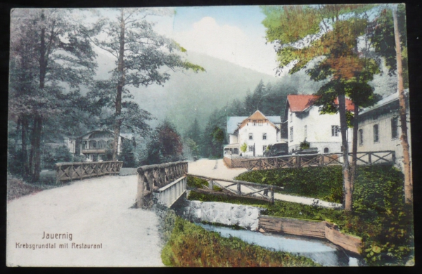Javorník (Jauernig), pohled přes most k restauraci, prošlá, stržená známka, Q2