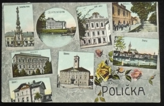 Polička, 8okénková pohlednice, nádraží, škola, nemocnice, radnice, prošlá, Q2