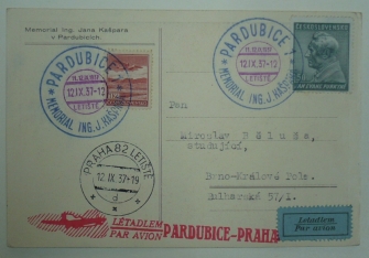pohlednice přepravená příležitostným letem Pardubice-Praha, příležitostné razítko PARDUBICE 1/ Memorial ing. J. Kašpara, průchozí razítko PRAHA 82 LETIŠTĚ/ 12.IX.37, kašet letu, zachovalé, kat. 200Kč
