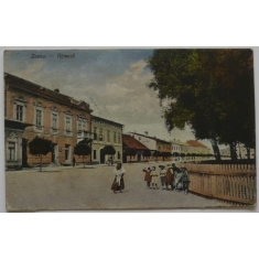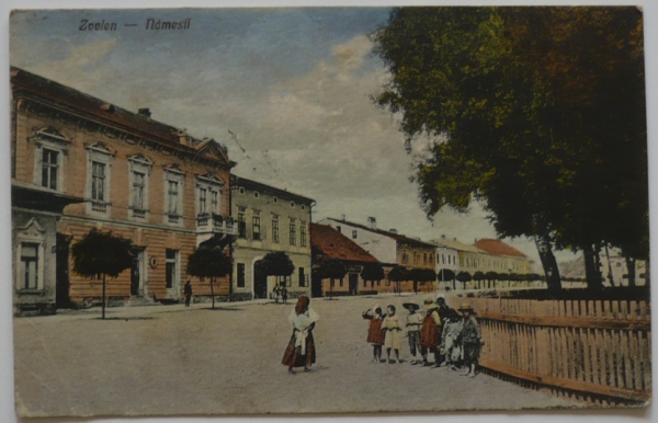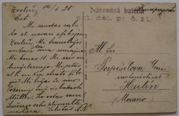 "KAMPAPOSTO", pohlednice (Zvolen, lidé, náměstí), řádkové útvarové razítko NÁHRADNÁ BATERIA/ POL. DĚL. PL. č. 11, pohlednice do Hulína, psáno esperantem; odřené růžky, jinak hezké