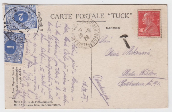 nedostatečně vyplacená celistvost, MONACO 26.9.29, zatíženo doplatným 1Kč a 2Kč, PRAHA 30.IX.29