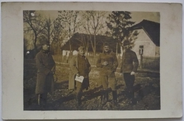 skupina vojáků, jeden s obálkou s českým nápisem POLNÍ POŠTA (sic!), prošlé přes FP 285 (100 bodů), útvarové razítko K.u.K. Feldspital Nr. 1/5; zajímavý dokument doby