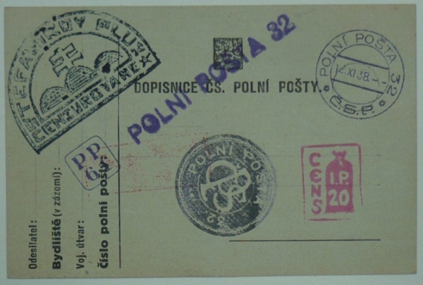 dopisnice polní pošty s razítkem 12.XI.38, neprošlá, otisky jiných razítek