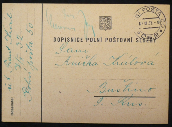dopisnice polní pošty s razítkem ?.XI.38; pochází z rozsáhlé sbírky
