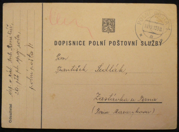 dopisnice polní pošty s razítkem 10.XI.38; pochází z rozsáhlé sbírky