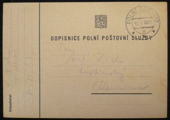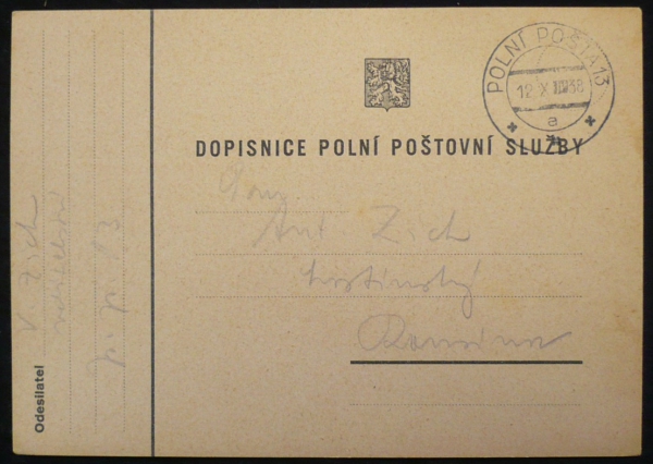 dopisnice polní pošty s razítkem 12.X.38; pochází z rozsáhlé sbírky