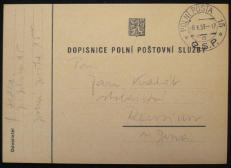 dopisnice polní pošty s razítkem 8.X.38; pochází z rozsáhlé sbírky