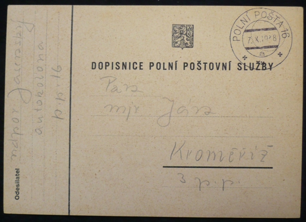dopisnice polní pošty s razítkem 7.X.38; pochází z rozsáhlé sbírky