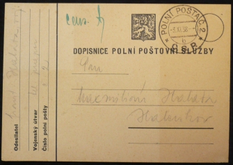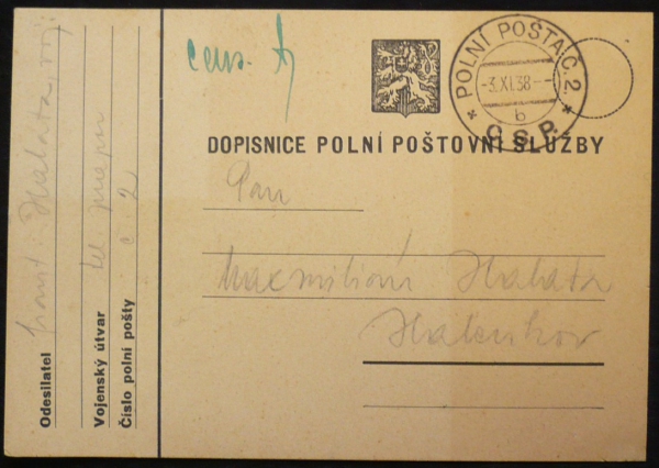dopisnice polní pošty s velkým státním znakem, s razítkem 3.XI.38; pochází z rozsáhlé sbírky