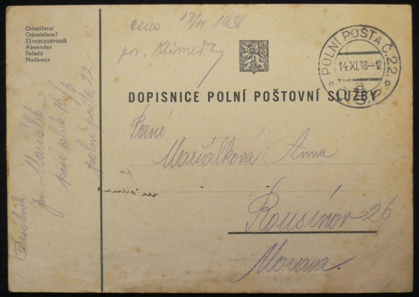 dopisnice polní pošty s razítkem 14.XI.38; lehké skvrny