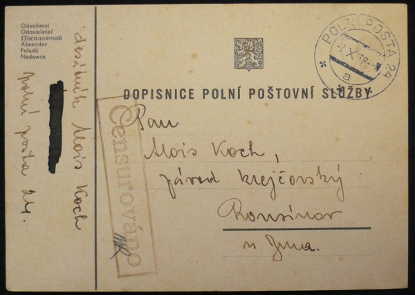 dopisnice polní pošty s razítkem 7.X.38, rámečkové razítko cenzury