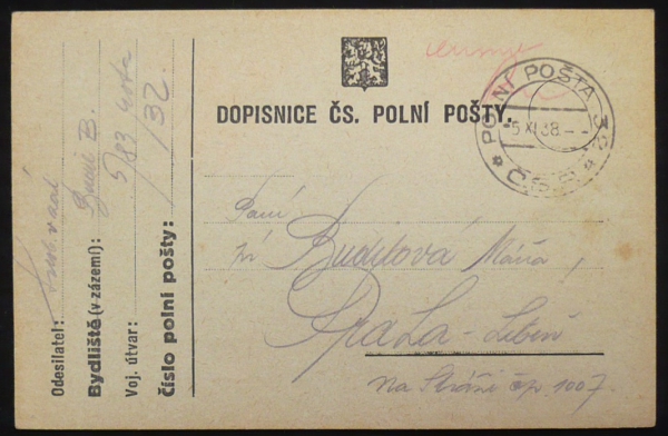 dopisnice polní pošty s razítkem 5.XI.38; pochází z rozsáhlé sbírky