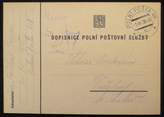 dopisnice polní pošty s razítkem 1.XI.38; pochází z rozsáhlé sbírky