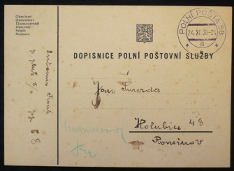 dopisnice polní pošty s razítkem 24.XI.38; pochází z rozsáhlé sbírky