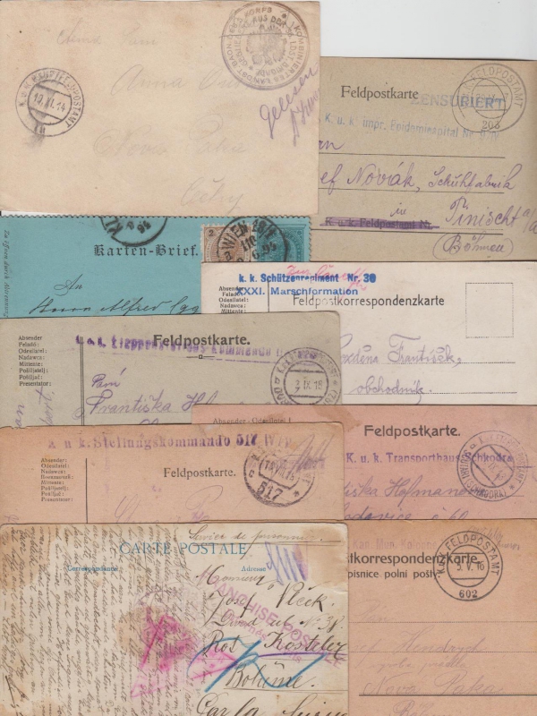 1914 Polní pošta, sestava 8 celistvostí
