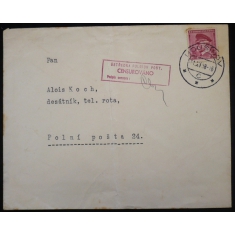 dopis na polní poštu 24 se známkou Masaryk 1Kč, razítko ROUSÍNOV 11.XI.38, červené rámečkové razítko ÚSTŘEDNA POLNÍCH POŠT/ CENSUROVÁNO; příčný sklad