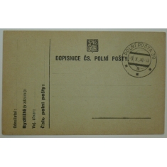 lístek polní pošty s natištěným obrázkem vojáka a s několika razítky polní pošty a s kašety
