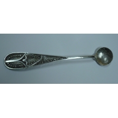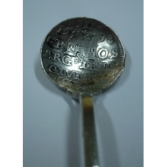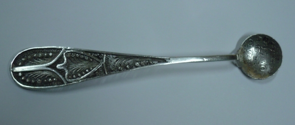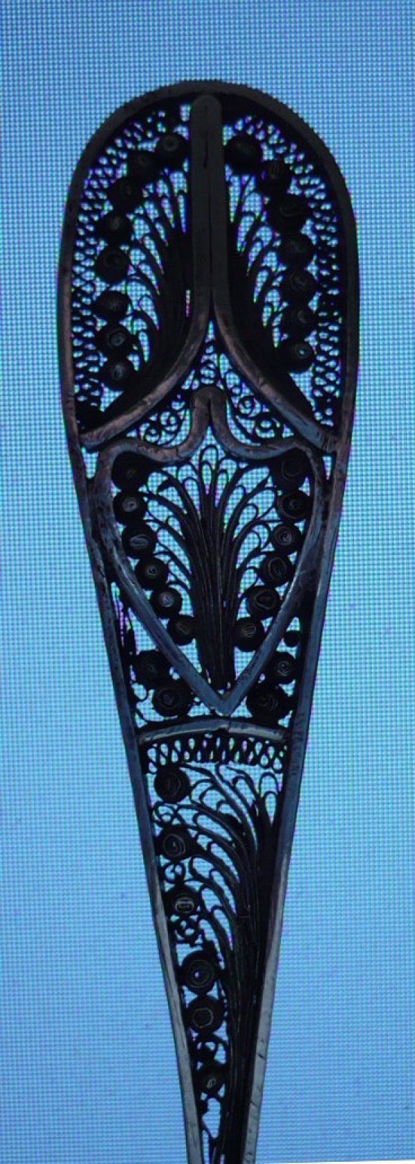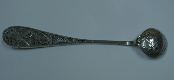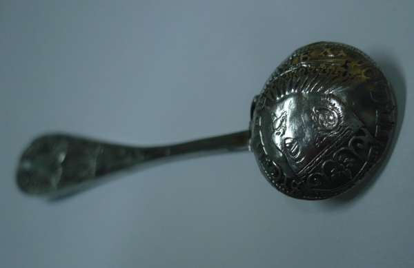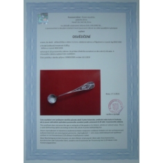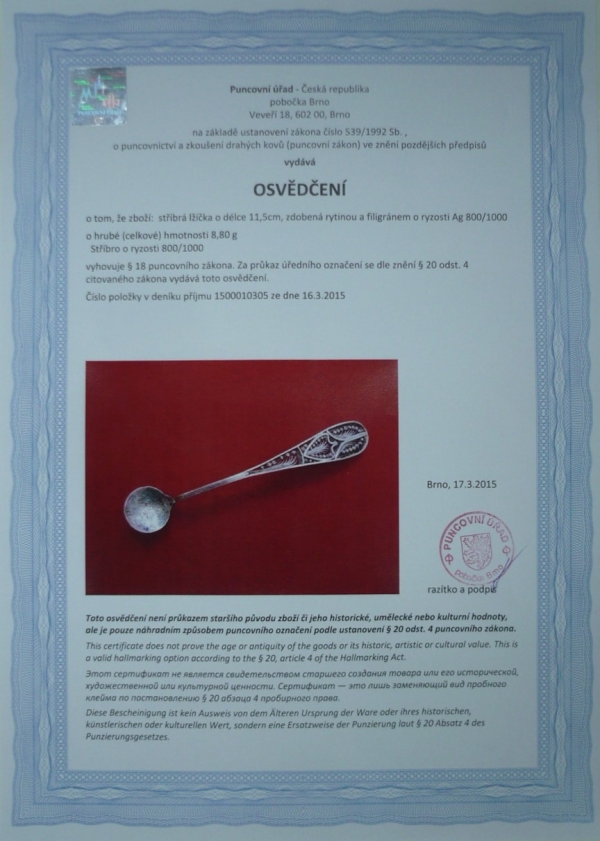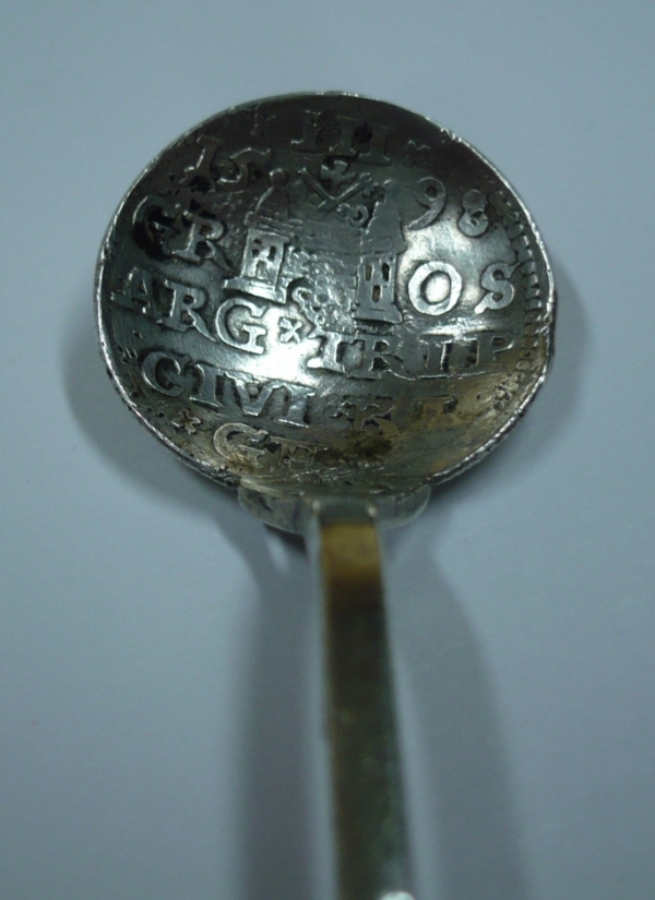 III Groš, Riga, 1598 GROS ARG TRIP CIVI RIGE, dobová mince ve tvaru lžičky, celkem 8,80g, Ag 800/1000, délka 11,5cm, filigránské zdobení rukojeti; včetně certifikátu Puncovního úřadu Brno