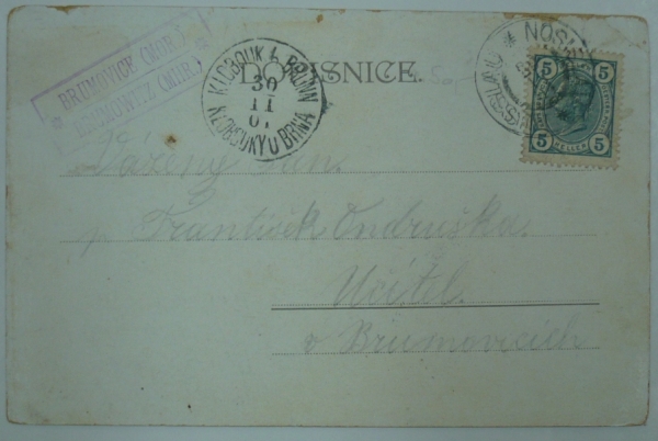 pohlednice do Blumovic, podací razítko NOSISLAV 29.XI.01, příchozí razítko KLOBOUKY U BRNA 30.XI.01 a razítko poštovny