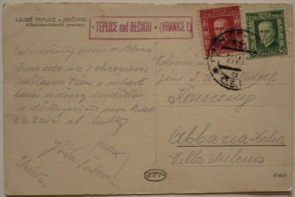 pohlednice do ciziny, červené razítko poštovny TEPLICE NAD BEČVOU (HRANICE), podací razítko HRANICE 23.VI.27; hezké