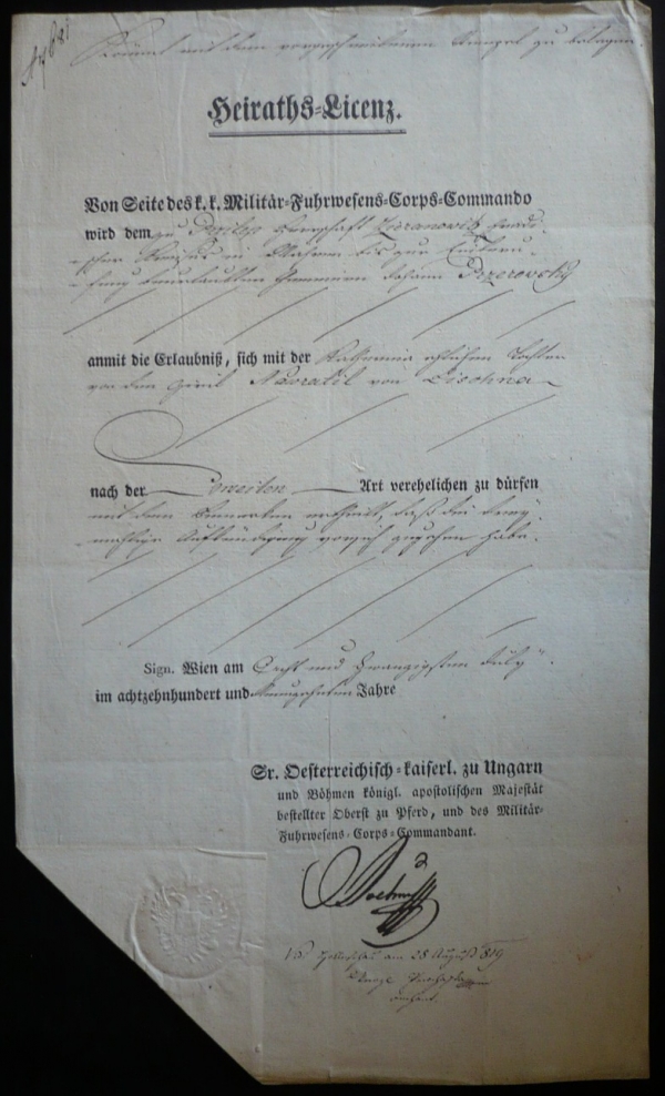 1819 Potvrzení o sňatku, vydalo vojenské velitelství