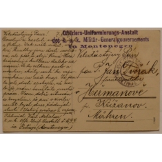 útvarové razítko OFFIZIERS-UNIFORMIERUNGS-ANSTALT/ DES K.U.K. MILITÄR-GENERALGOUVERNEMENTS/ IN MONTENEGRO, podací razítko 7.X.17; psáno česky, hezké