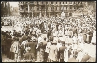 fotopohlednice, Sokoli, slavnostní průvod, foto Dítě, prošlá, stržená známka, Q3 - zlomený roh