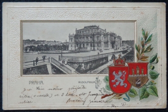 koláž "obraz v rámečku", Rudolfinum, erby, tlačená, prošlá, dlouhá adresa, Q2