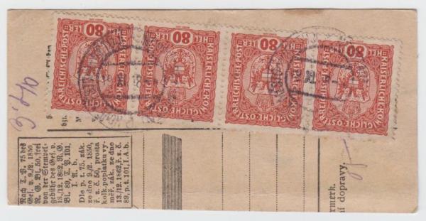 ústřižek průvodky s páskou MICHEL 197 (4x), 222, NOVÉ MĚSTO NAD METUJÍ 19.XI.18; katalog Hirš 500,-