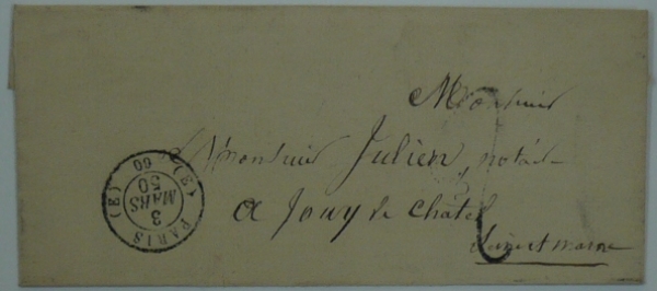 maloformátový skládaný dopis, razítko PARIS 3.III.50, vzadu příchozí razítko; hezké