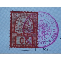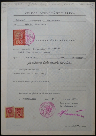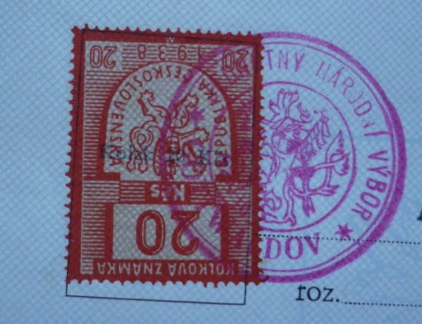 obráceně nalepený kolek 20Kčs emise 1938 na listině "Osvědčení o státní příslušnosti" z roku 1950, včetně 2 dávkových známek; zajímavé!