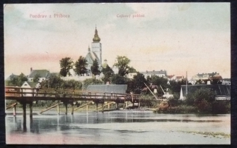 pohled ke kostelu, lávka přes řeku, prošlá, Q1
