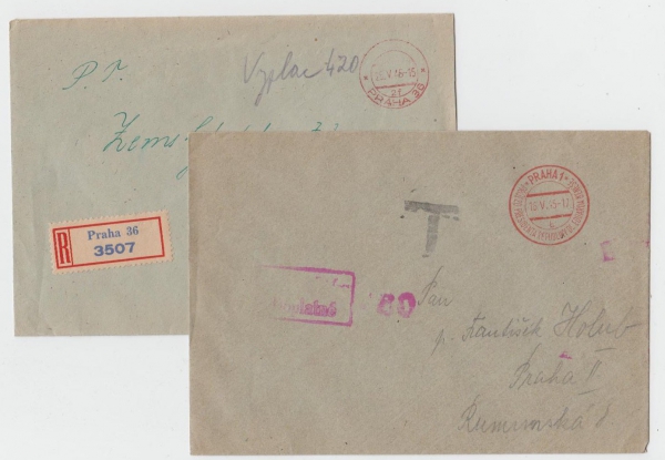 1945 Příležitostné razítko + doplatek, sestava 2 dopisů, zn toho 1x R