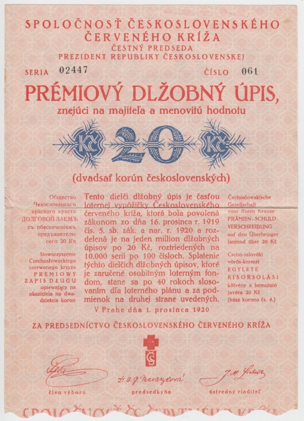 1920 Prémiový dlužební úpis Československého Červeného kříže