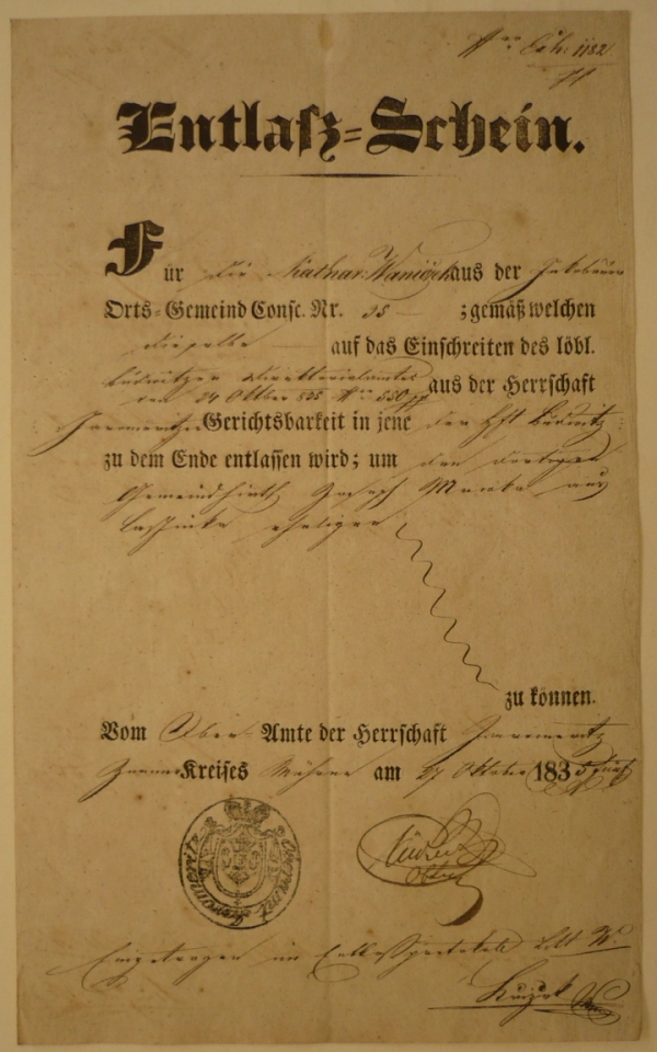 ozdobně tištěná propouštěcí listina pro Kateřinu Vaníčkovou z jaroměřického panství, pěkné razítko panské kanceláře