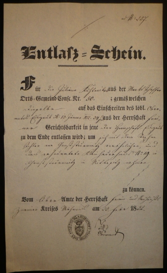 1832 Propouštěcí list z panství Vranov na panství Lednice