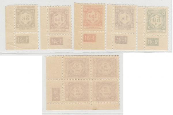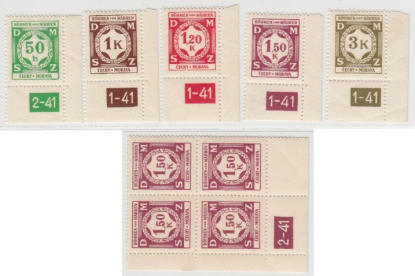 4 dolní rohové kusy s deskovým číslem 1-41 a SL8 ve čtyřbloku s DČ 2-42; svěží, katalog 180Kč