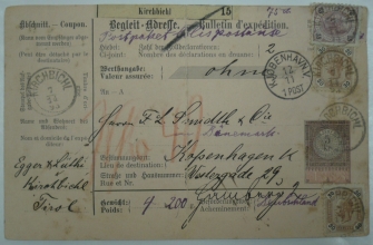 celá průvodka s vtištěným kolkem 5Kr 1888 s bohatou frankaturou, KIRCHBICHL 7/14/95, příchozí razítko KOBENHAVN; přeloženo, lehké skvrny