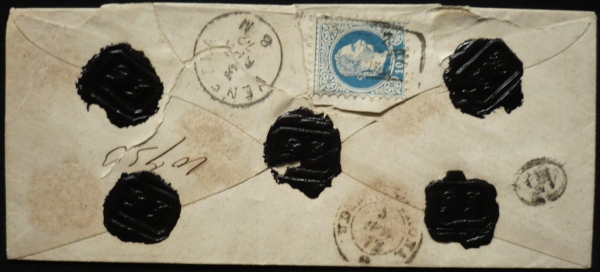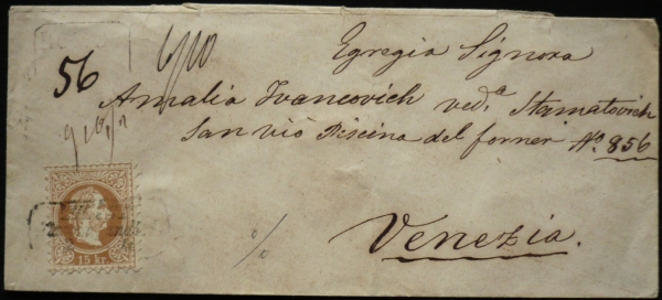 frankatura emise 1867 15Kr + 10Kr, pečetě, příchozí razítko VENEZIA; nešetrně otevřeno