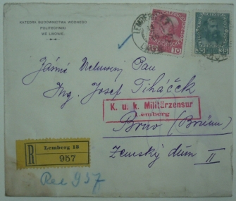 R dopis ze Lvova do Brna, razítko LEMBERG 11/7/16, rámečkové cenzurní razítko Lemberg, vzadu lehké skvrny